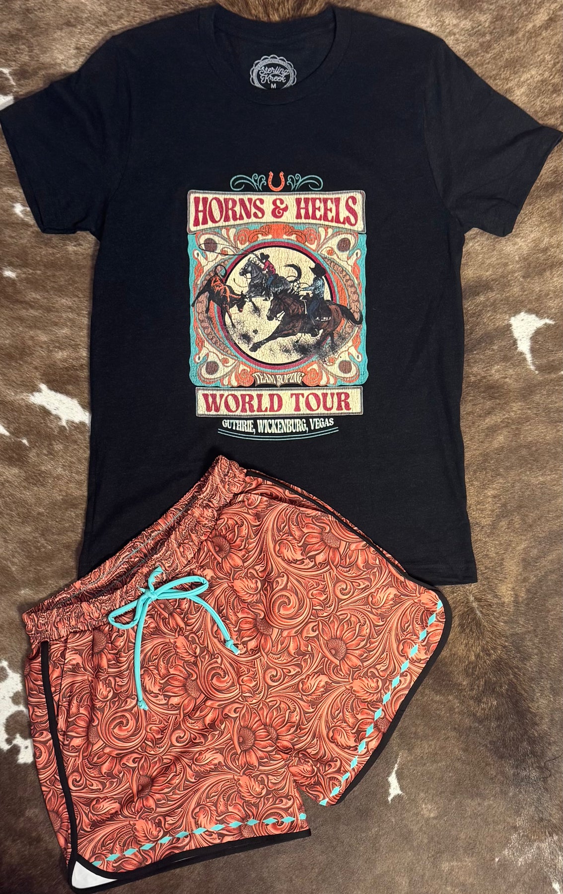 Show off your playful side with these Tooled Beauty Shorts! The tooled pattern with turquoise accents adds a touch of quirkiness to your wardrobe, while the draw string ensures a comfortable fit. Made from butter soft material, these shorts are cute and comfy for any occasion.