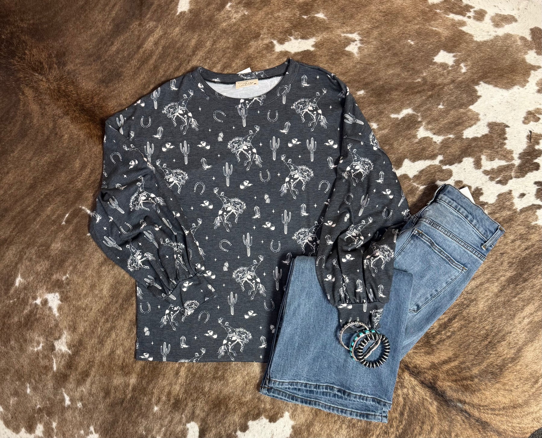 - -Western Bucking Horses Print Relaxed Fit Long Sleeve Light Weight French Terry Sweatshirt. Made with 78% Polyester,18% Rayon, and 4% Spandex.