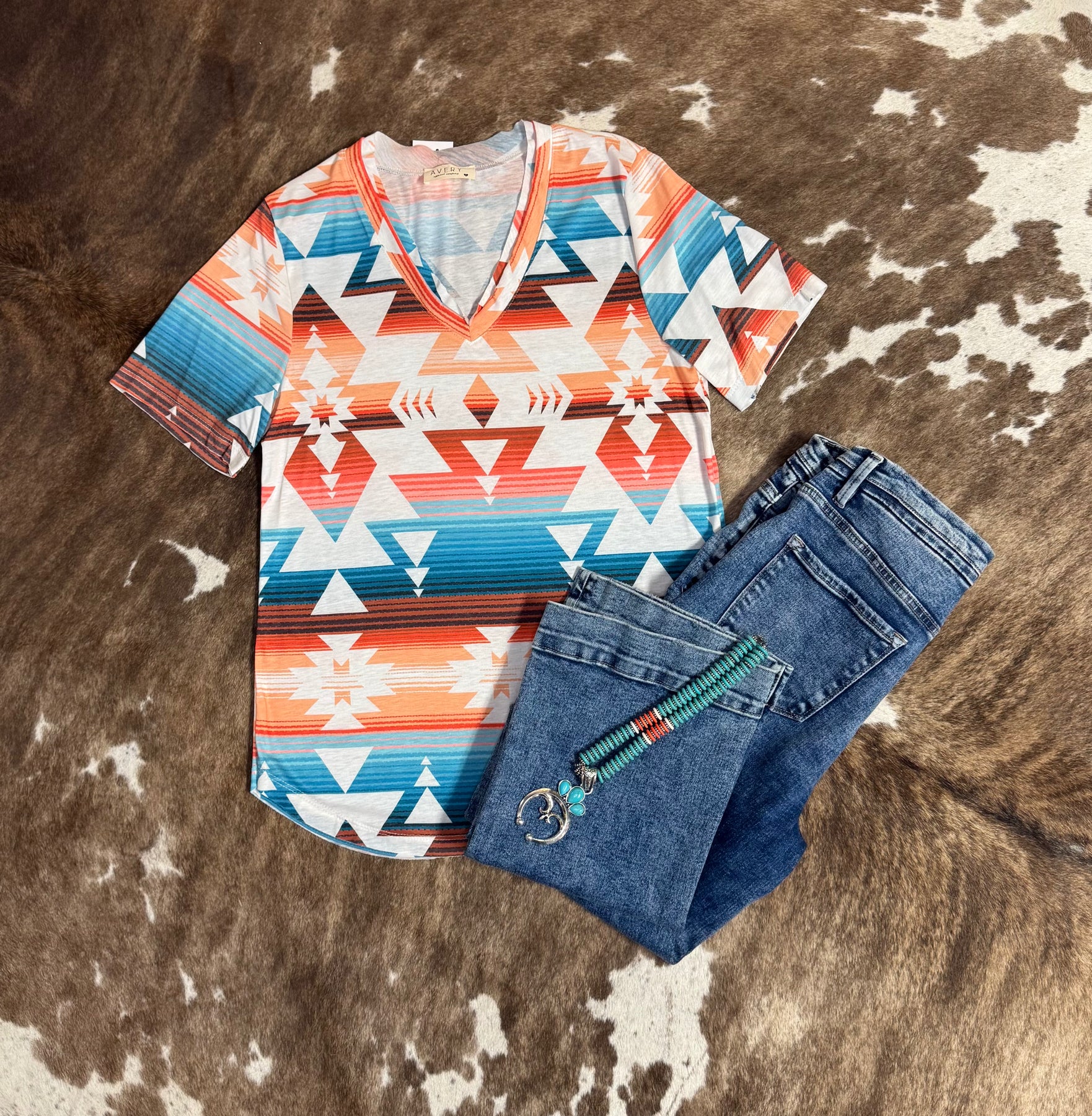 - Immerse yourself in the vibrant aesthetics of the West with Terra Bella Relaxed V Neck Top. Designed with a relaxed fit and short sleeves, it is perfect for a day at work or a casual outing. Made with a blend of 78% polyester, 18% rayon, and 4% spandex, it offers comfort and durability.