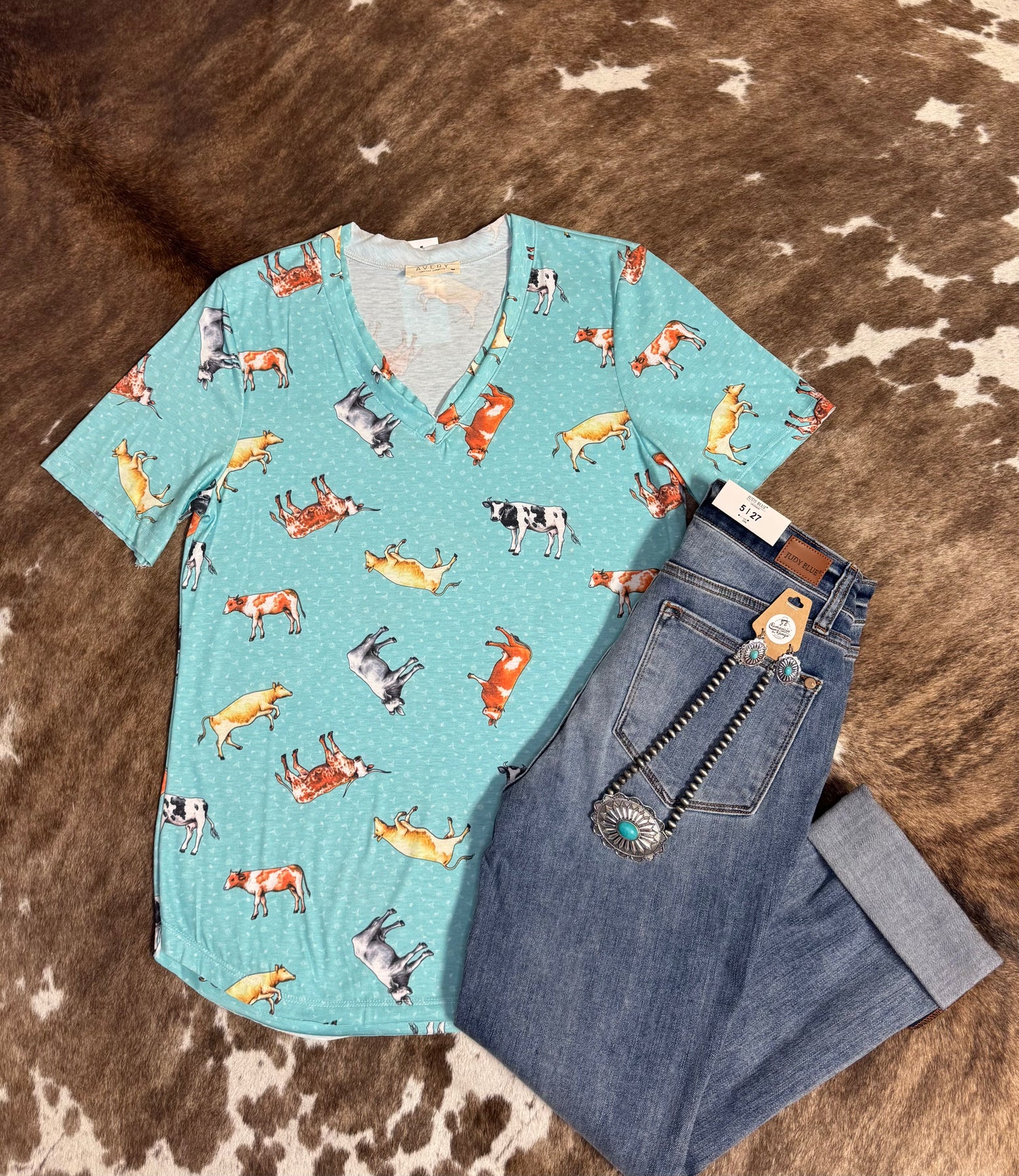 • Unleash your wild side with the Cerritos Cow Print Short Sleeve V Neck Top. Designed with a Western aesthetic, this top is a must-have for any modern wardrobe. The fabric blend of 78% Polyester, 18% Rayon, and 4% Spandex ensures a comfortable fit that's perfect for work or play. Plus, its machine washable for easy care.