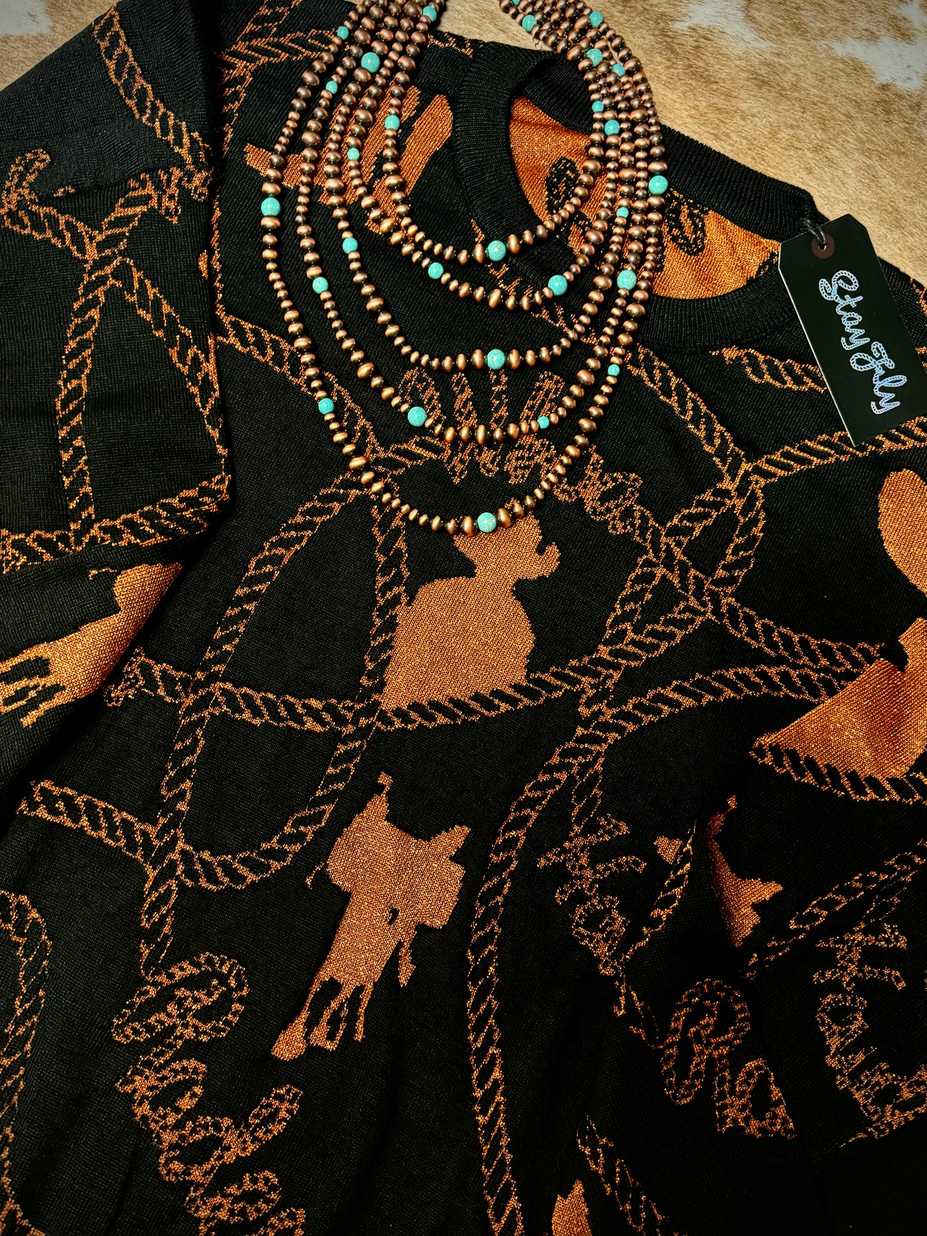 - This 2FLY medium weight sweater is adorned with an amazing copper metallic design that is sure to stand out in a crowd. It's the perfect color combo to pair with your copper & turquoise jewelry. A must have in your wardrobe for those rodeo nights or a day with your gal pals! Latte anyone?