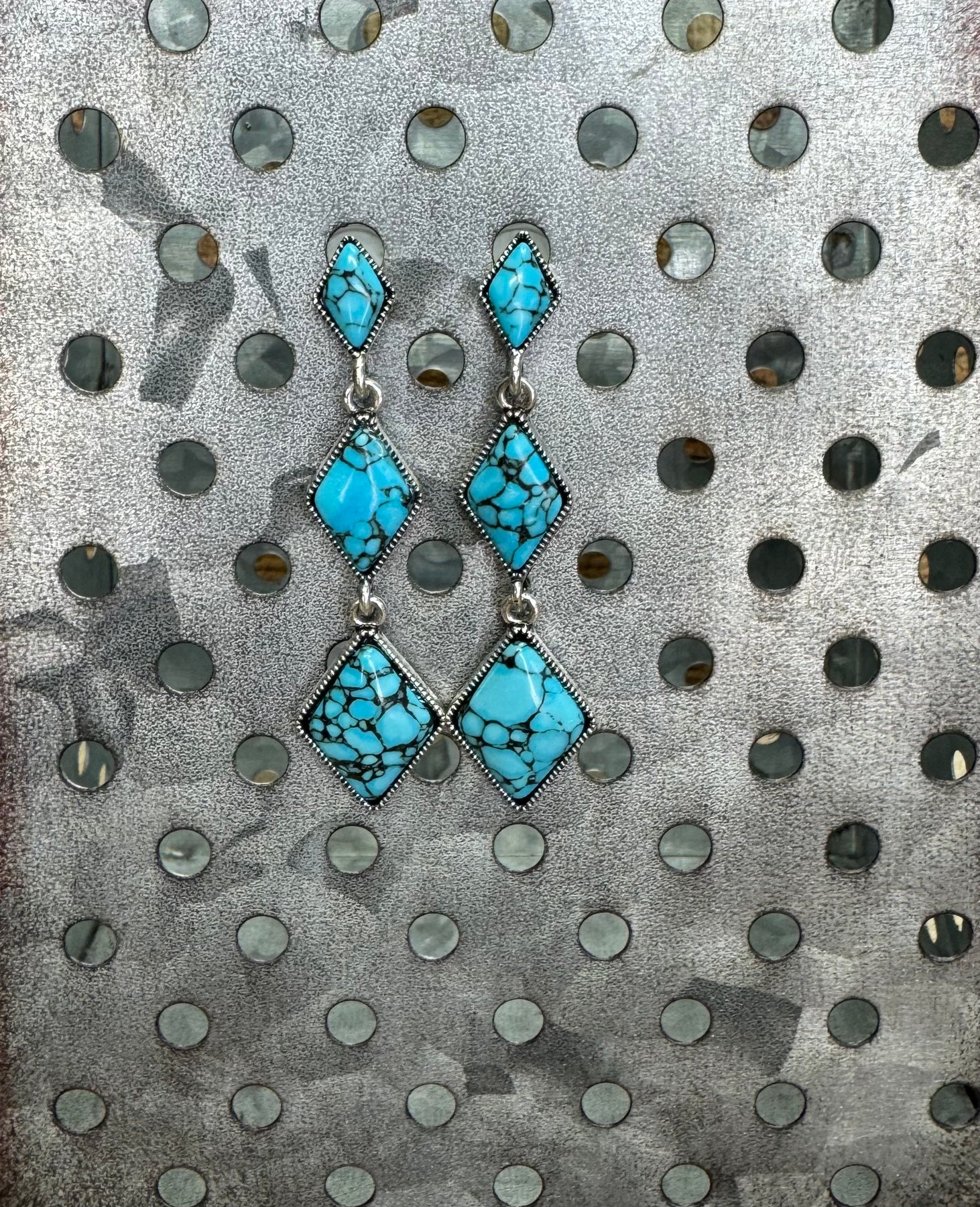 • "Add a pop of color to your look with Sterling Kreek's Desert Treasure Earrings! Featuring dangling turquoise diamonds, these earrings bring a unique touch to any outfit. Embrace your playful side and stand out from the crowd with these quirky and fun earrings.
