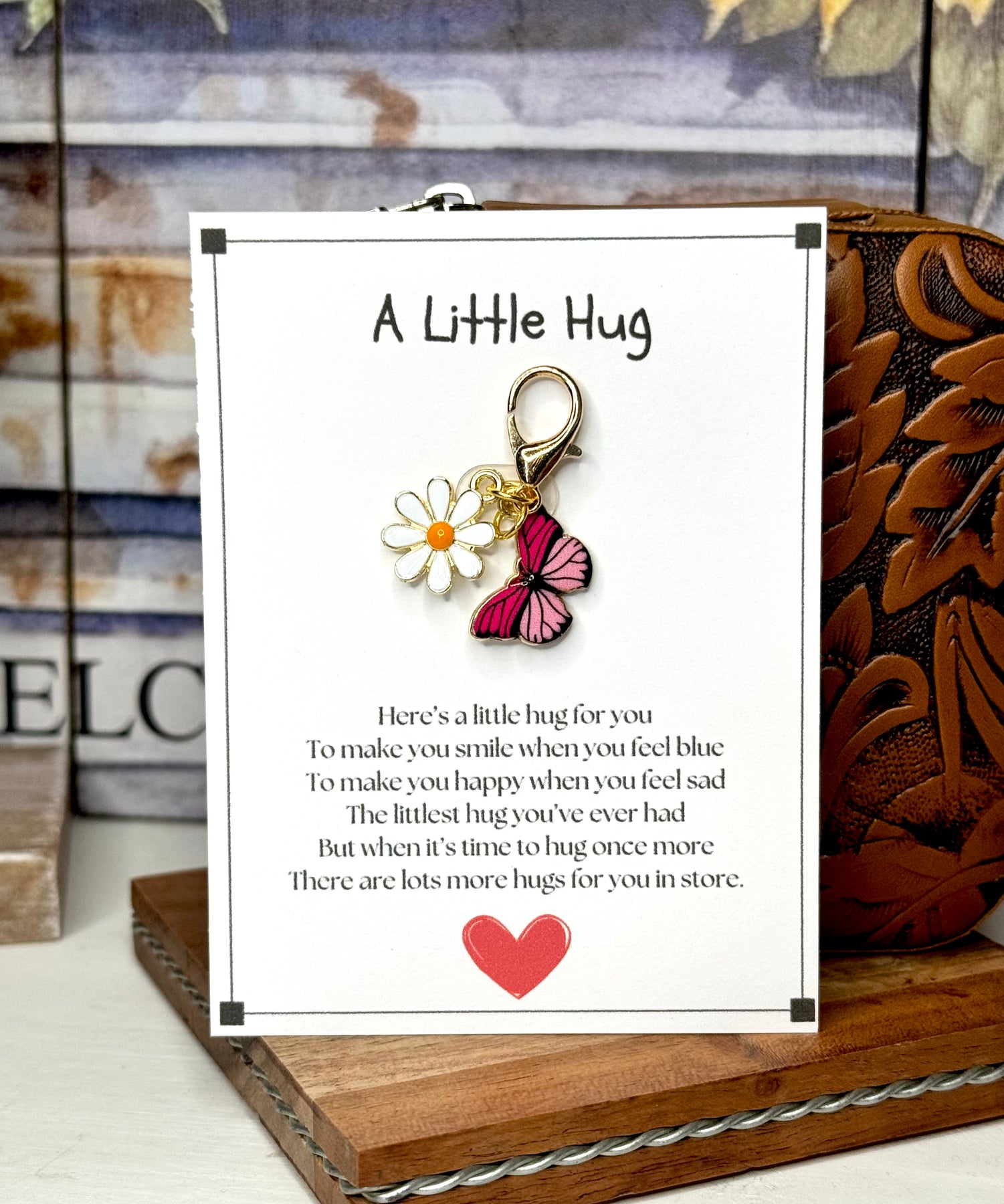 - These cute little hug cards are perfect for that special person who needs... well, a hug. These metal enameled butterflies, hearts and daisy flowers come with a lobster clasp and have a special message on a 3x4 card.