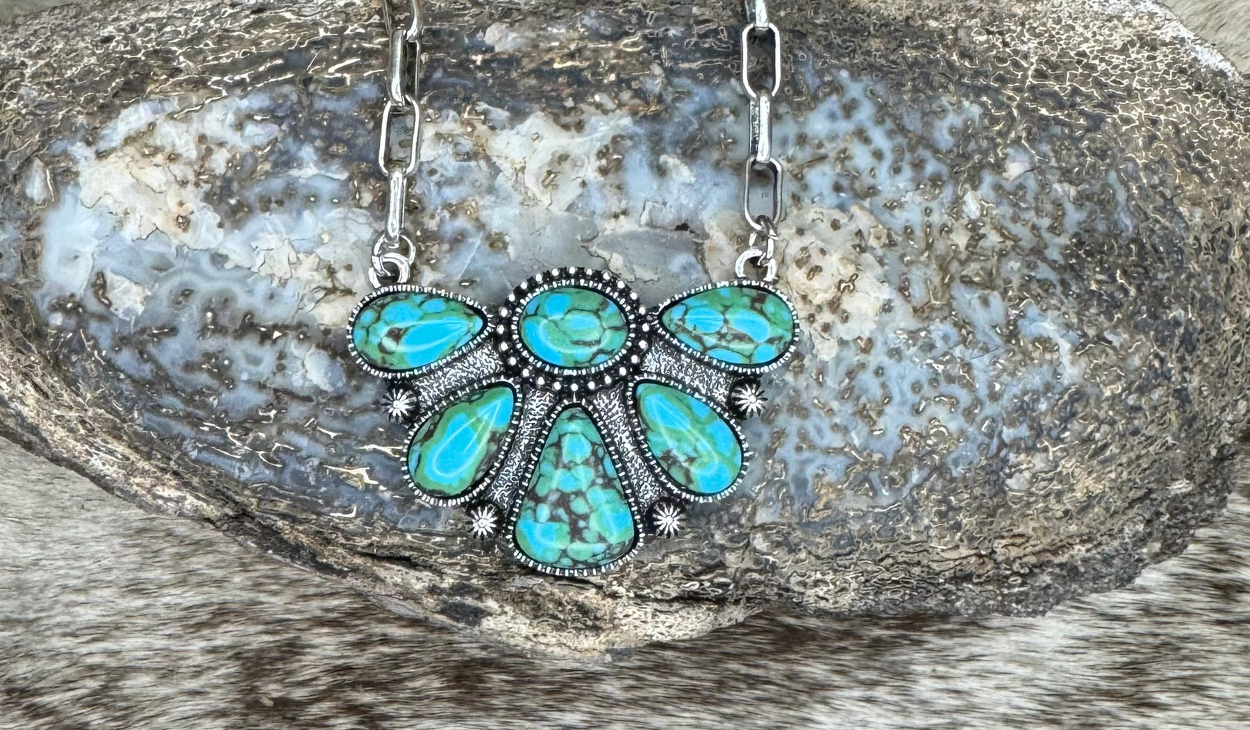 Unleash your inner outlaw with our Turquoise Tombstone Necklace! This edgy piece features 6 turquoise stones arranged in a half crescent shape on a trendy paperclip chain. Perfect for adding a touch of western charm to any outfit. Giddy up!