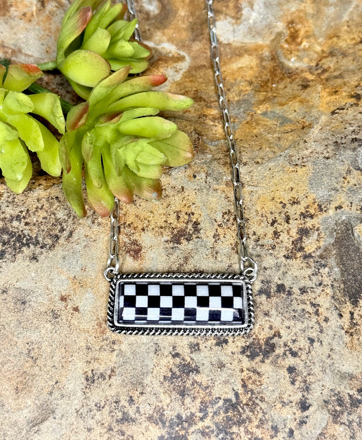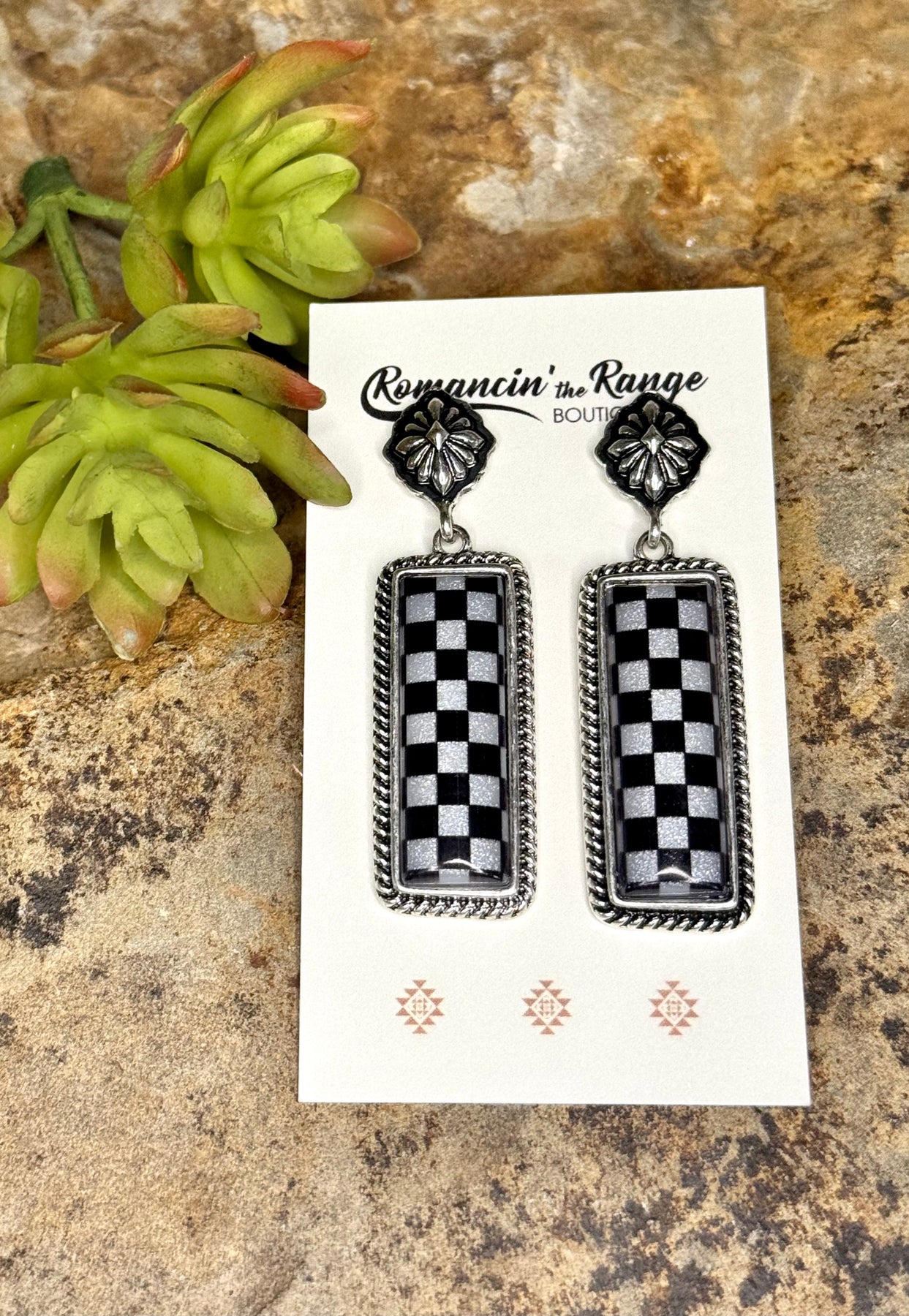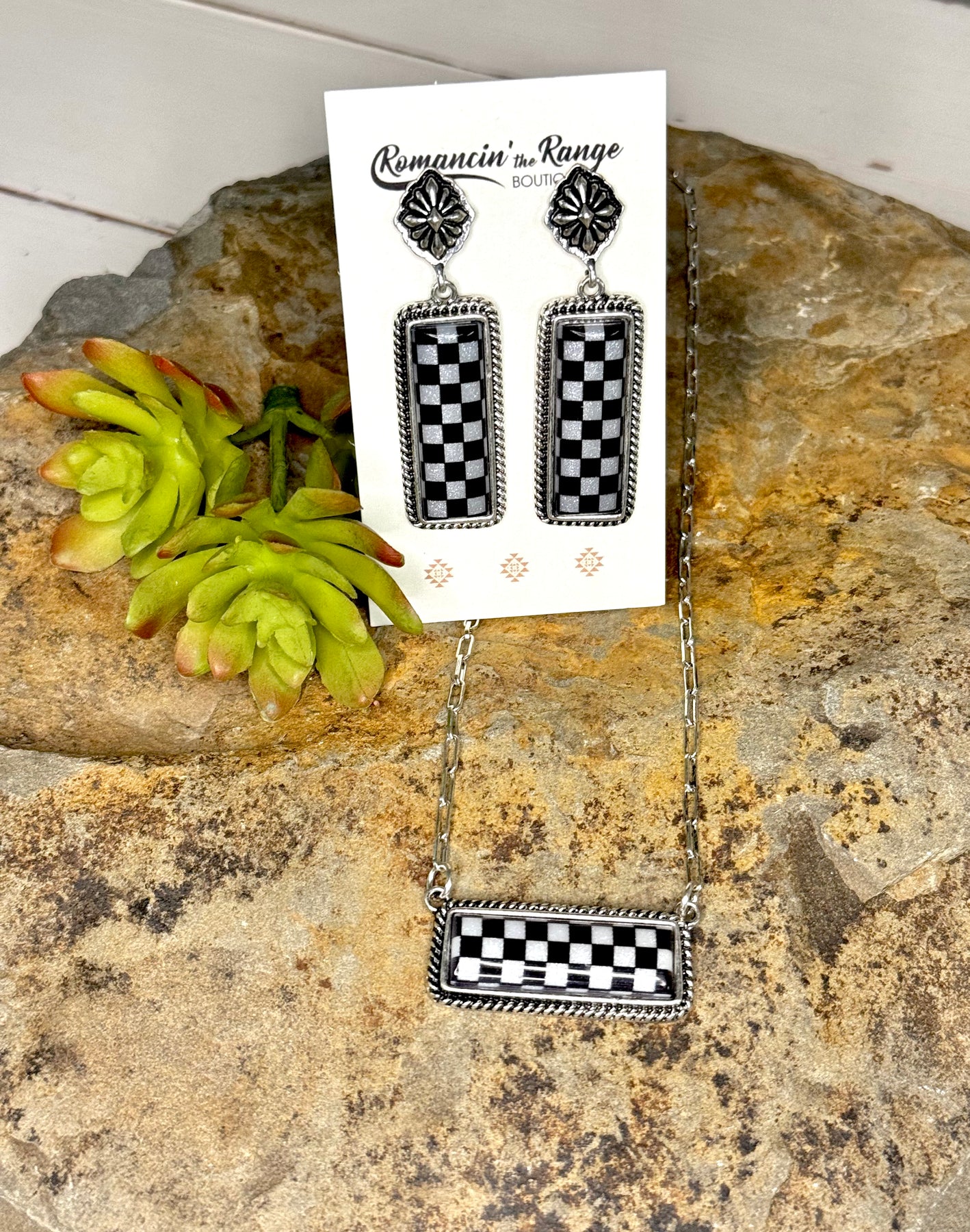 - These checkered earrings and necklace are the must have for the season.
